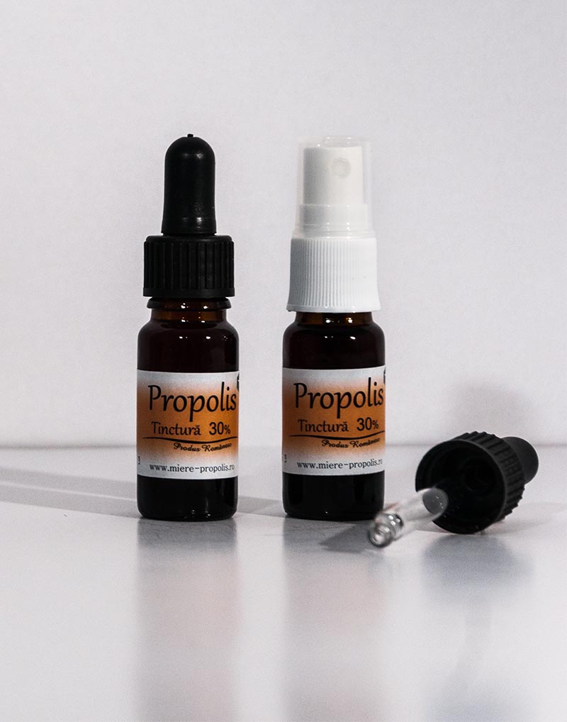 Tinctura de propolis în flacon cu pipeta sau tip spray. Alegeți tipul de flacon mai jos.